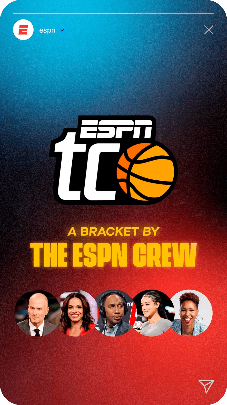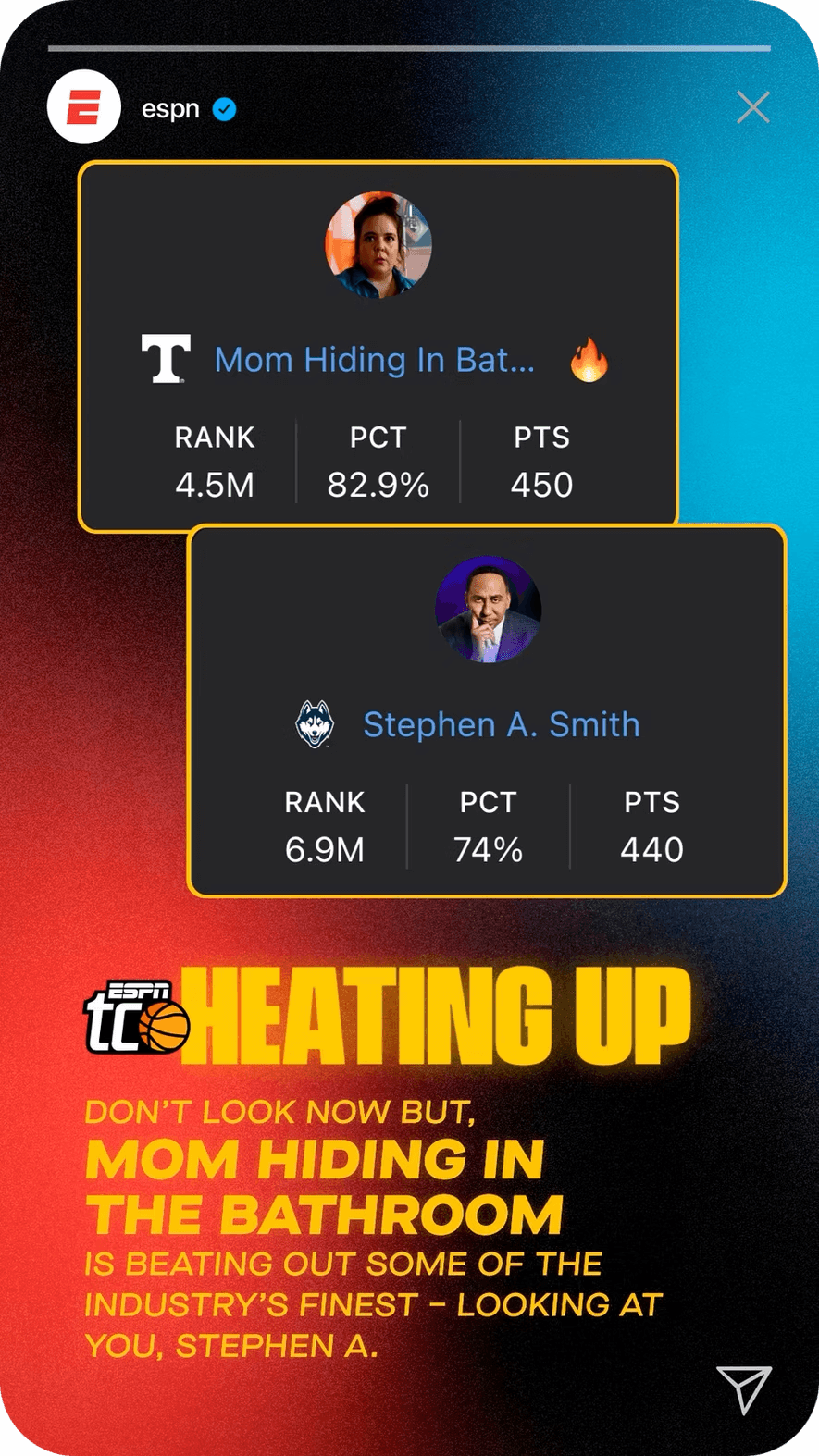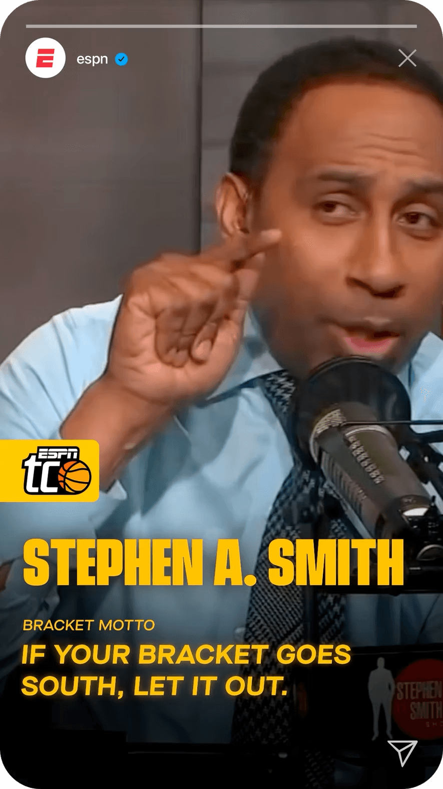 To reach more casual fans and prove that anyone can bracket, we built a cast of unlikely characters to be the faces of our campaign. They weren't just the heroes of the TV spots, they each got their own brackets and went toe-to-toe with ESPN personalities with Stephen A. Smith and Monica McNutt.