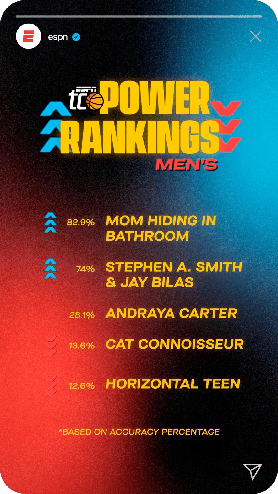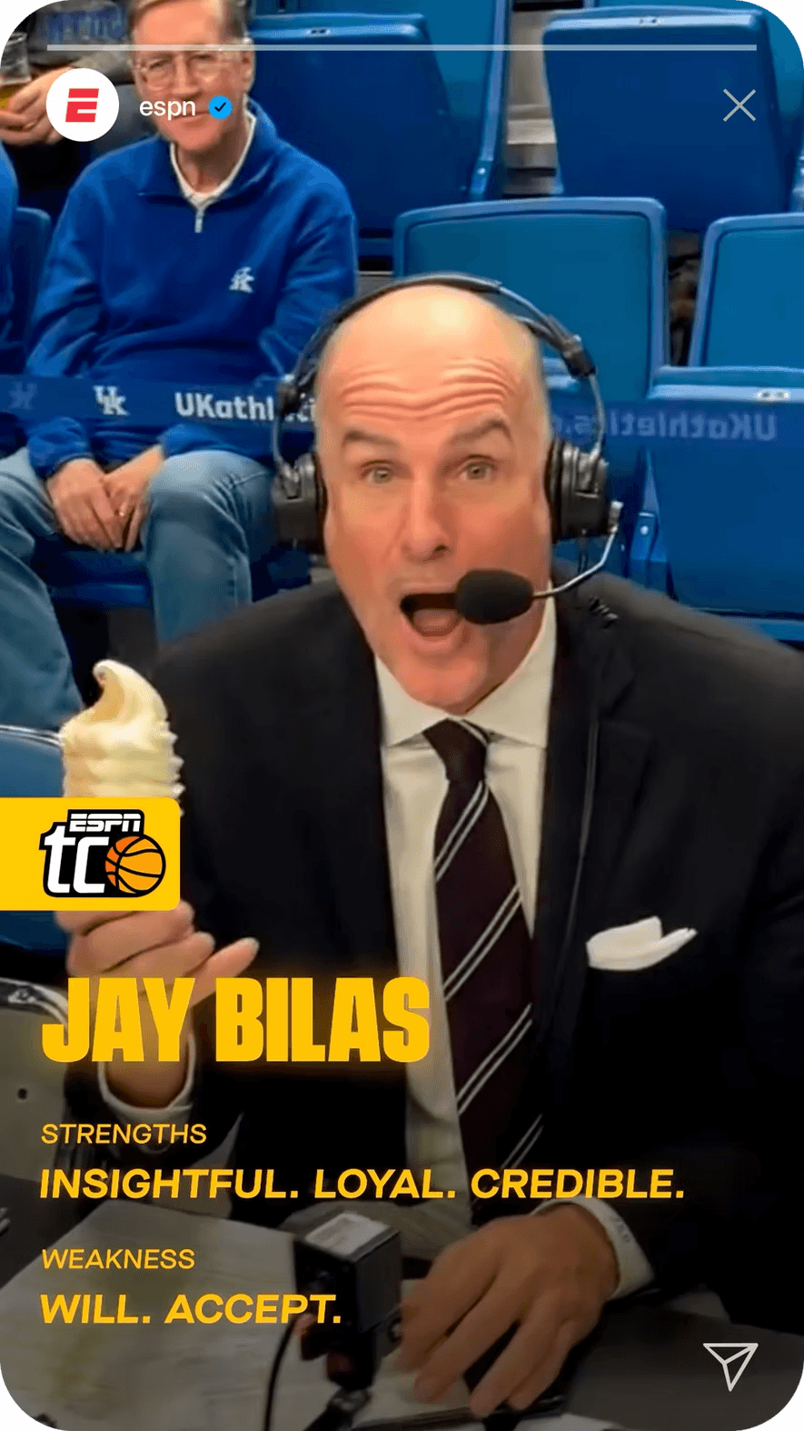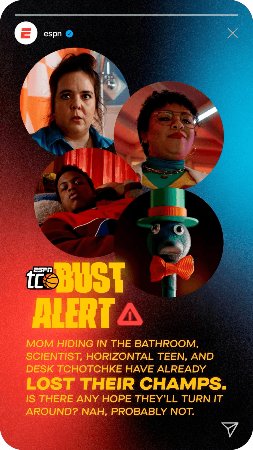 To reach more casual fans and prove that anyone can bracket, we built a cast of unlikely characters to be the faces of our campaign. They weren't just the heroes of the TV spots, they each got their own brackets and went toe-to-toe with ESPN personalities with Stephen A. Smith and Monica McNutt.